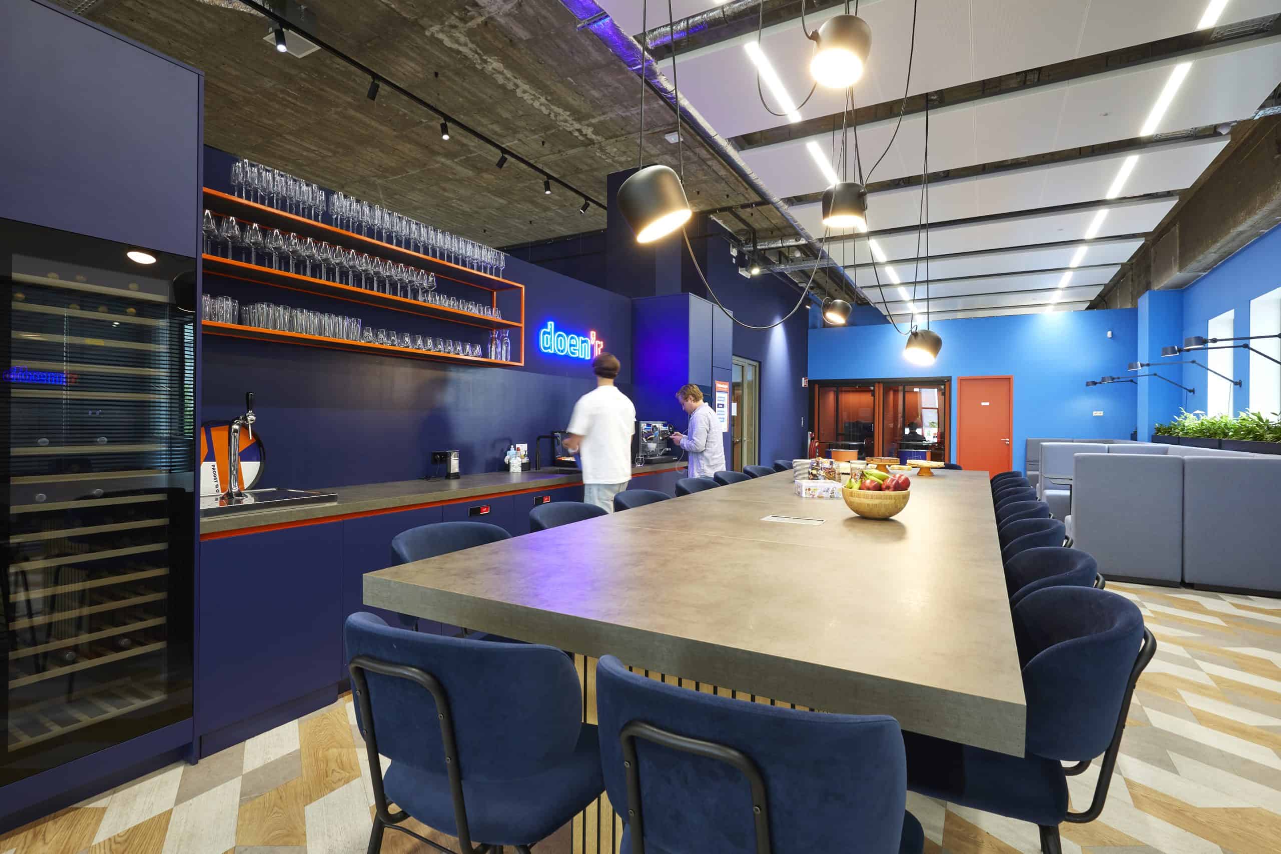 Het interieur sluit naadloos aan op de identiteit van doen’r. De blauwe kleur uit het logo vormt de rode draad, aangevuld met oranje accenten die zorgen voor warmte en contrast. Het ruwe betonskelet van het pand blijft zichtbaar en krijgt tegenwicht van houten elementen en veel groen. De sfeer? Stoer, industrieel en uitnodigend. Ook qua techniek is er aan alles gedacht: goede akoestiek, klimaatbeheersing en slimme verlichting zorgen voor comfort op alle fronten.