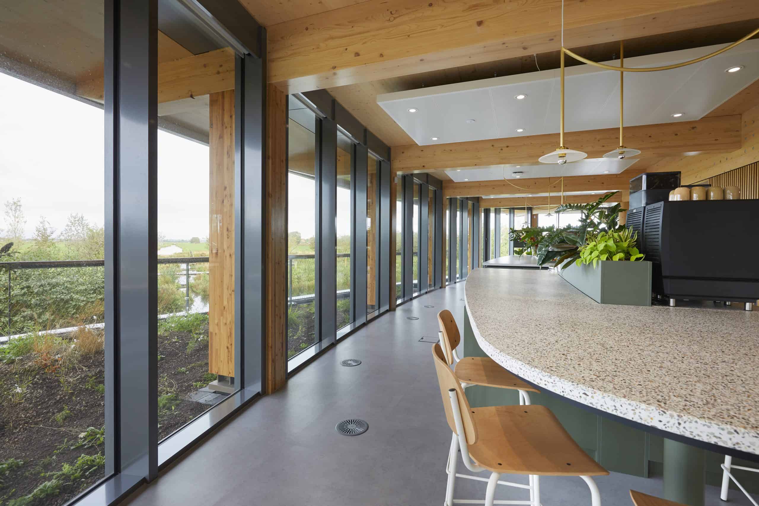 Grote ramen en open zichtlijnen brengen het polderlandschap letterlijk naar binnen. De centrale boom in het atrium vormt het groene hart van het gebouw, waar daglicht, lucht en ontmoeting samenkomen.